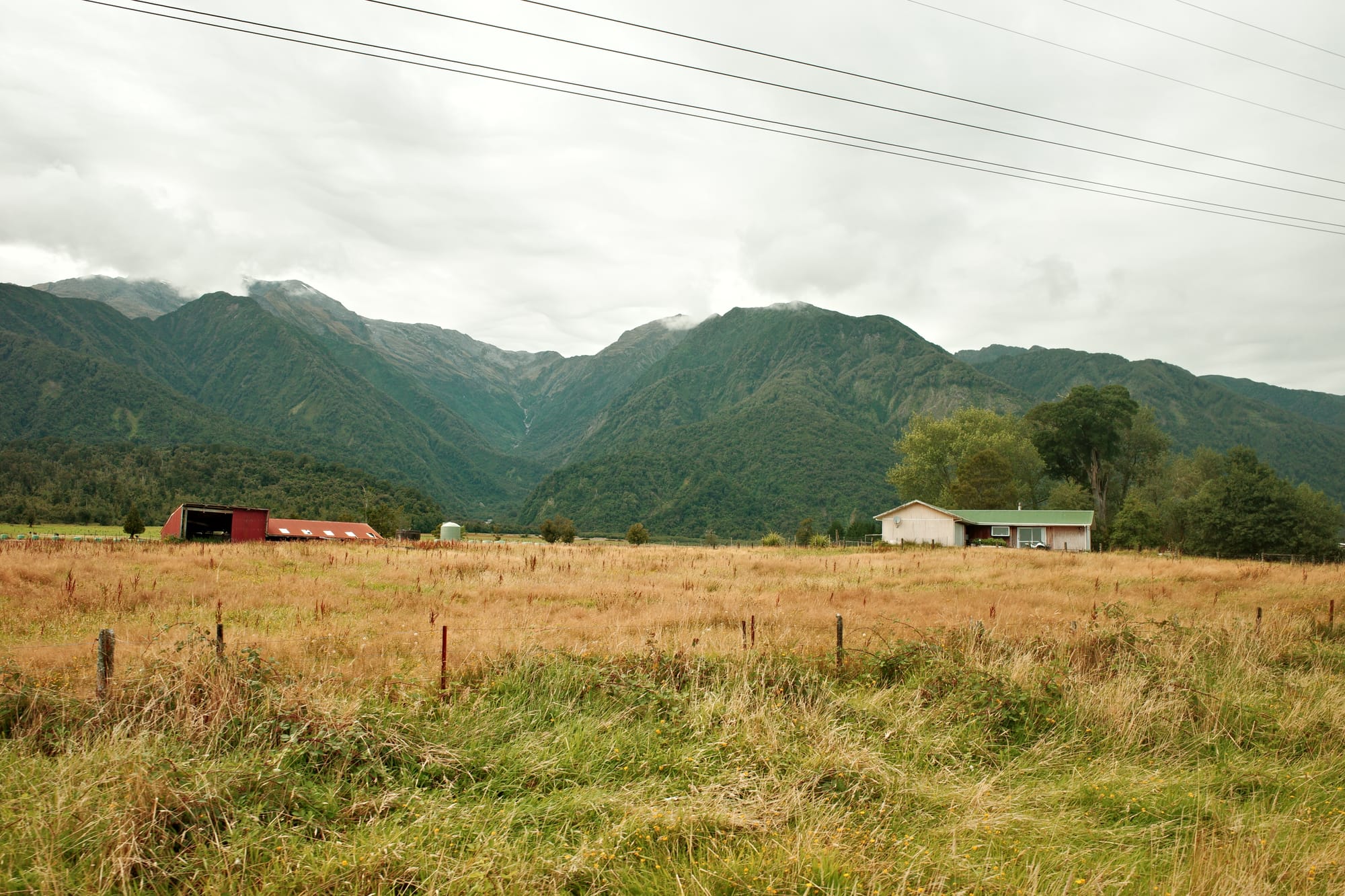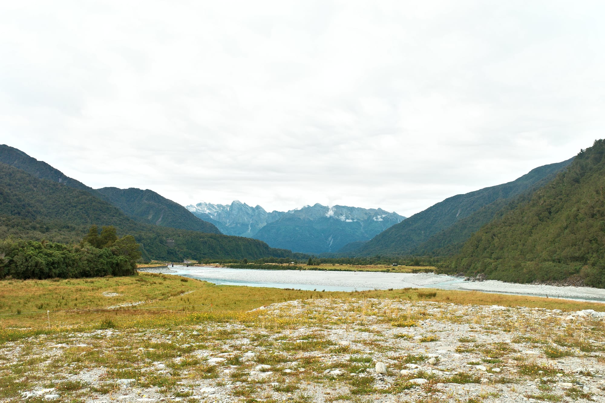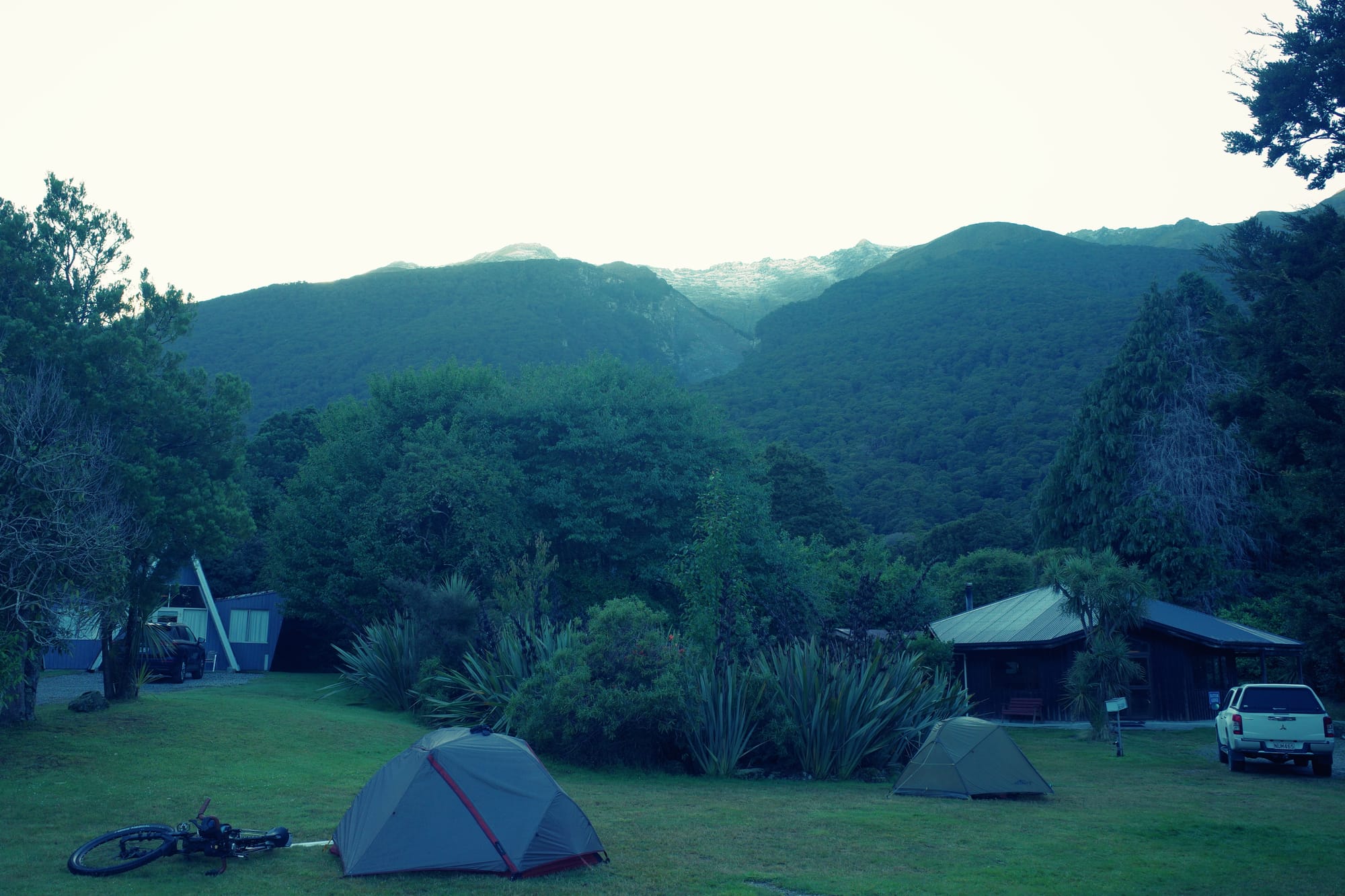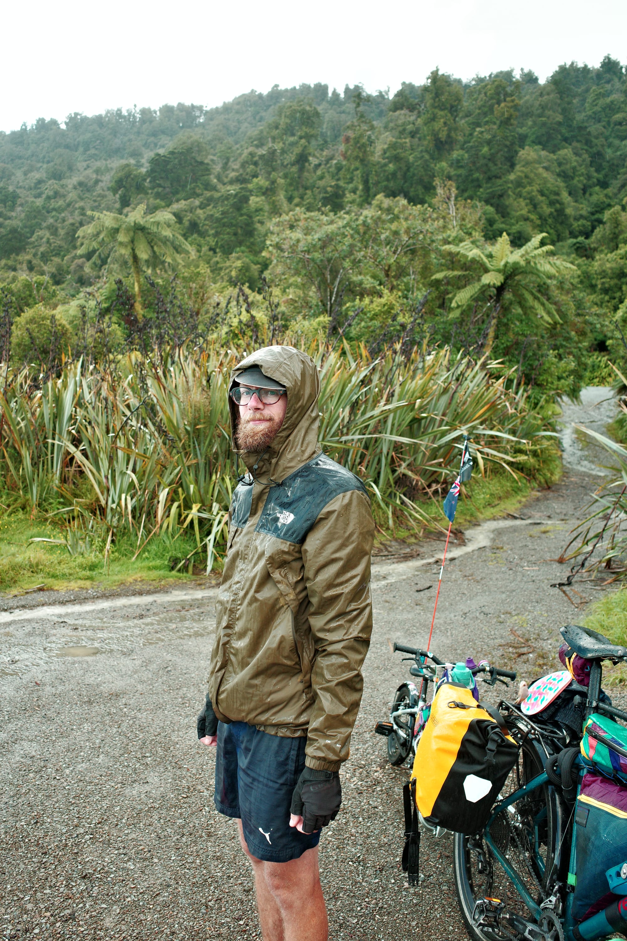 Het regent de hele nacht door, en 's ochtends pakken we onze tent in in de regen. De route tussen Frans Josef (waar een gletsjer is) en Fox Glacier (zoals de naam al zegt, ook een gletsjer) is druk. Het is een stroom aan campers, het is koud en het regent. We moeten drie stevige klimmetjes doen en we zijn koud en doorweekt tegen dat we Fox inrollen.