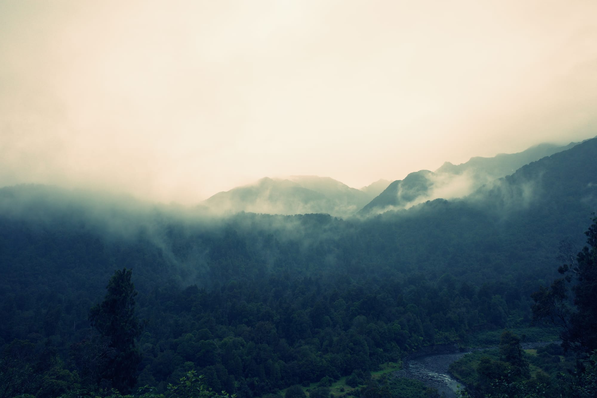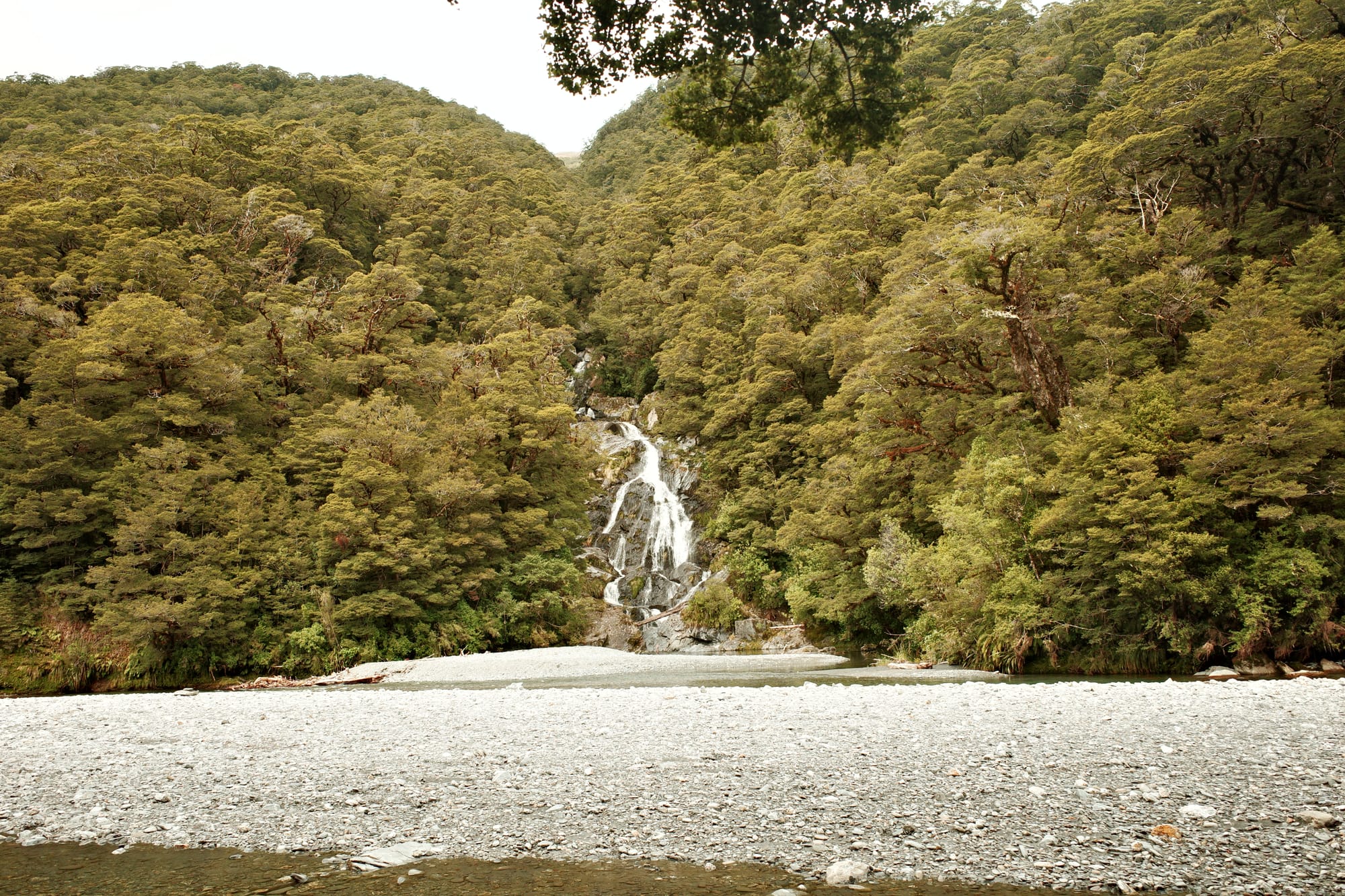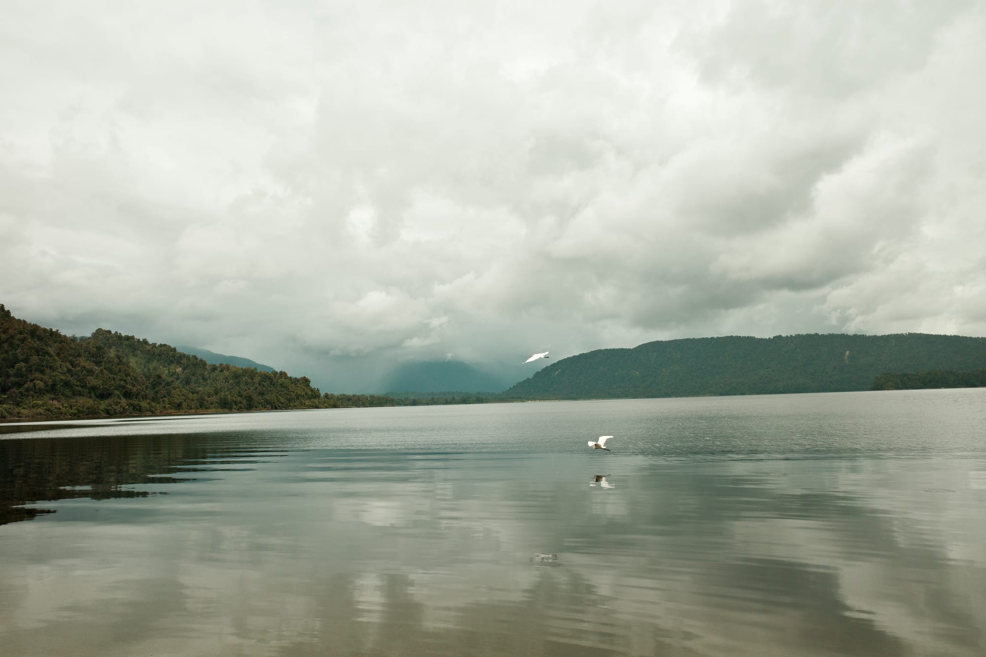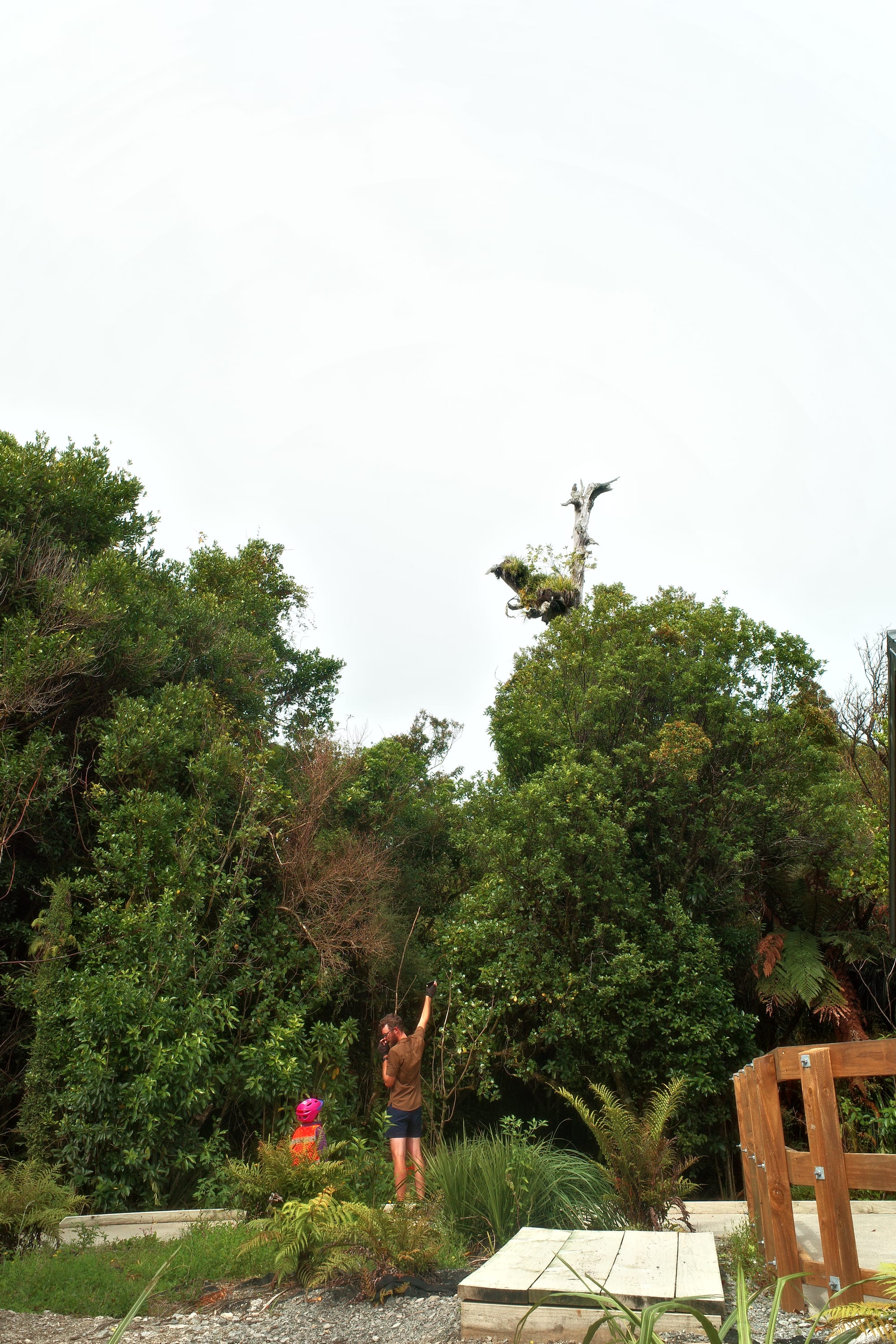Het regent de hele nacht door, en 's ochtends pakken we onze tent in in de regen. De route tussen Frans Josef (waar een gletsjer is) en Fox Glacier (zoals de naam al zegt, ook een gletsjer) is druk. Het is een stroom aan campers, het is koud en het regent. We moeten drie stevige klimmetjes doen en we zijn koud en doorweekt tegen dat we Fox inrollen.
