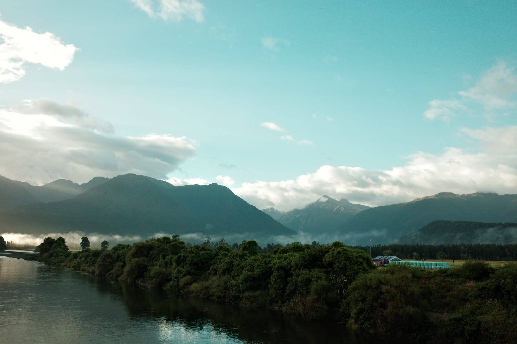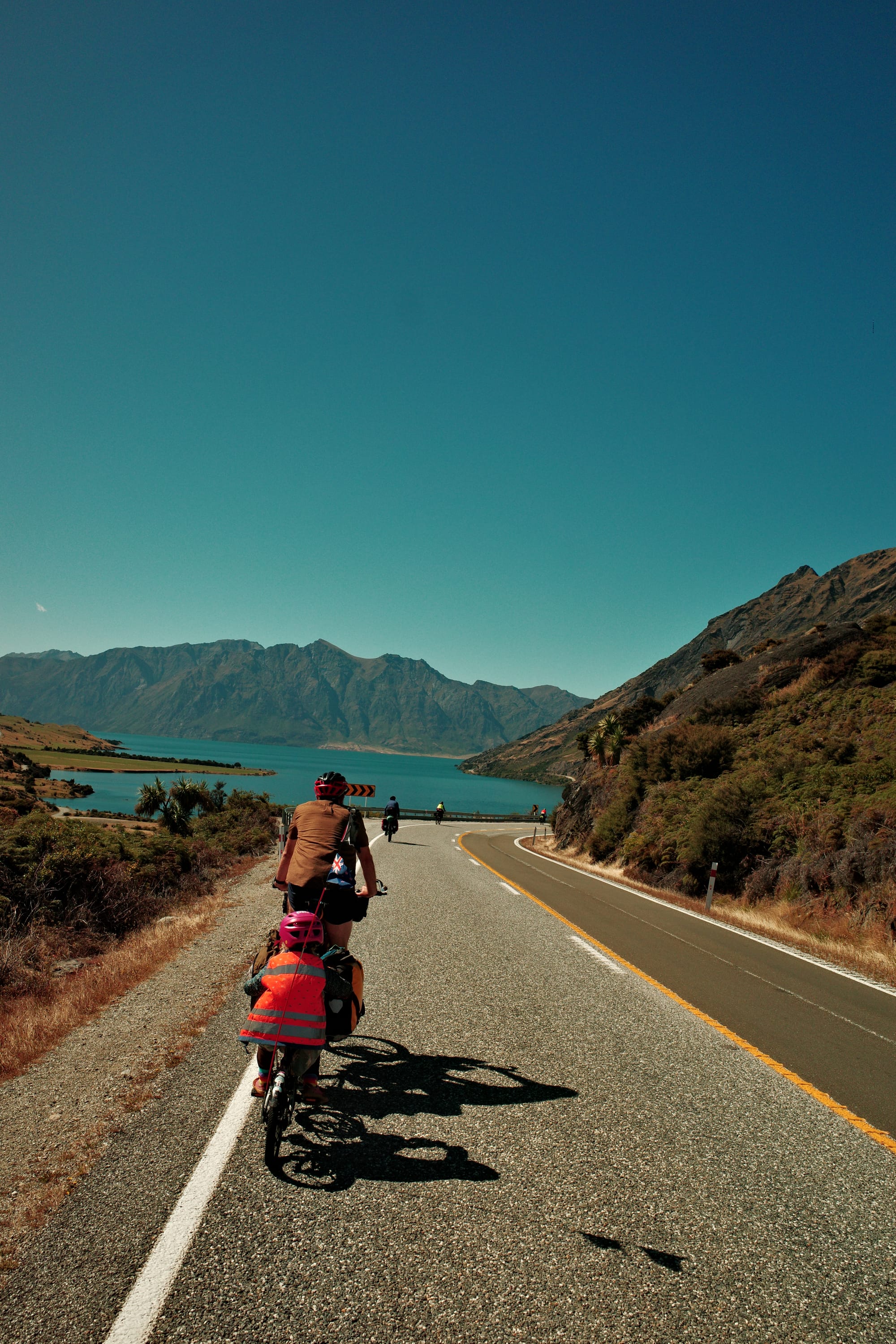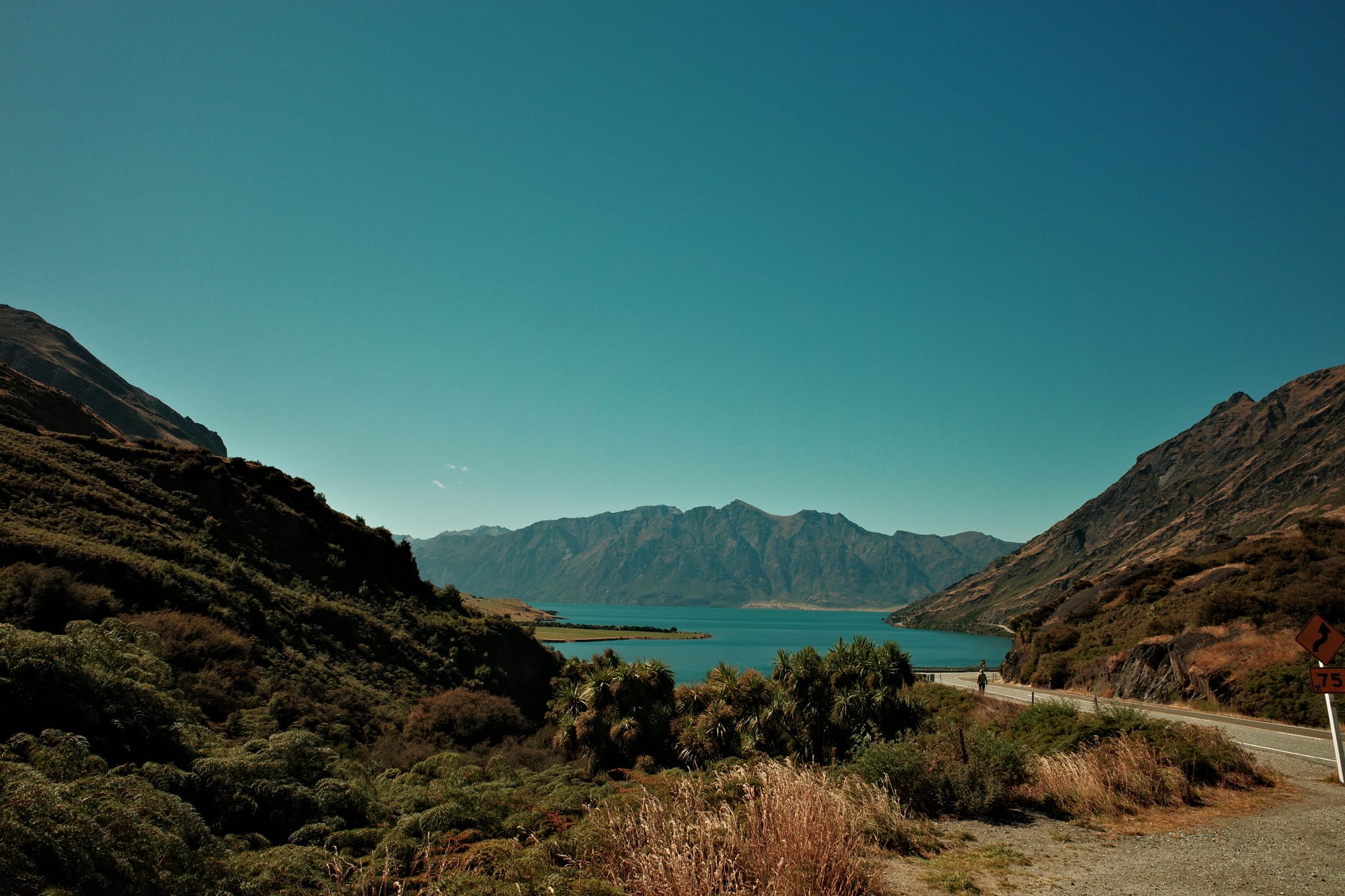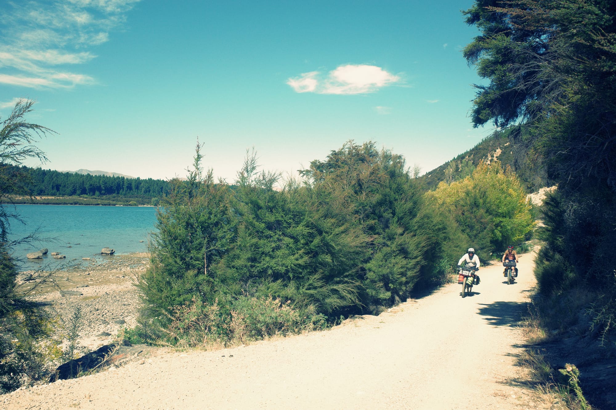 De omgeving wordt langzaam ruiger en de toppen hoger. Helaas hebben we ook een gigantische aanvaring met een klootzak op de weg die ons van de weg wil hebben (Kiwi's herhalen een quote uit de LOTR het meest: GET OF THE ROAD!). Nadat hij ons vrij letterlijk bijna aanrijdt, wij hem compleet de huid volschelden (sorry mam en pap, jullie hebben me beter opgevoed) en we daarna een kwartier moeten bekomen van de adrenaline, fietsen we met een klein hartje verder. De bochten worden smaller, het zicht slechter en het verkeer drukker...