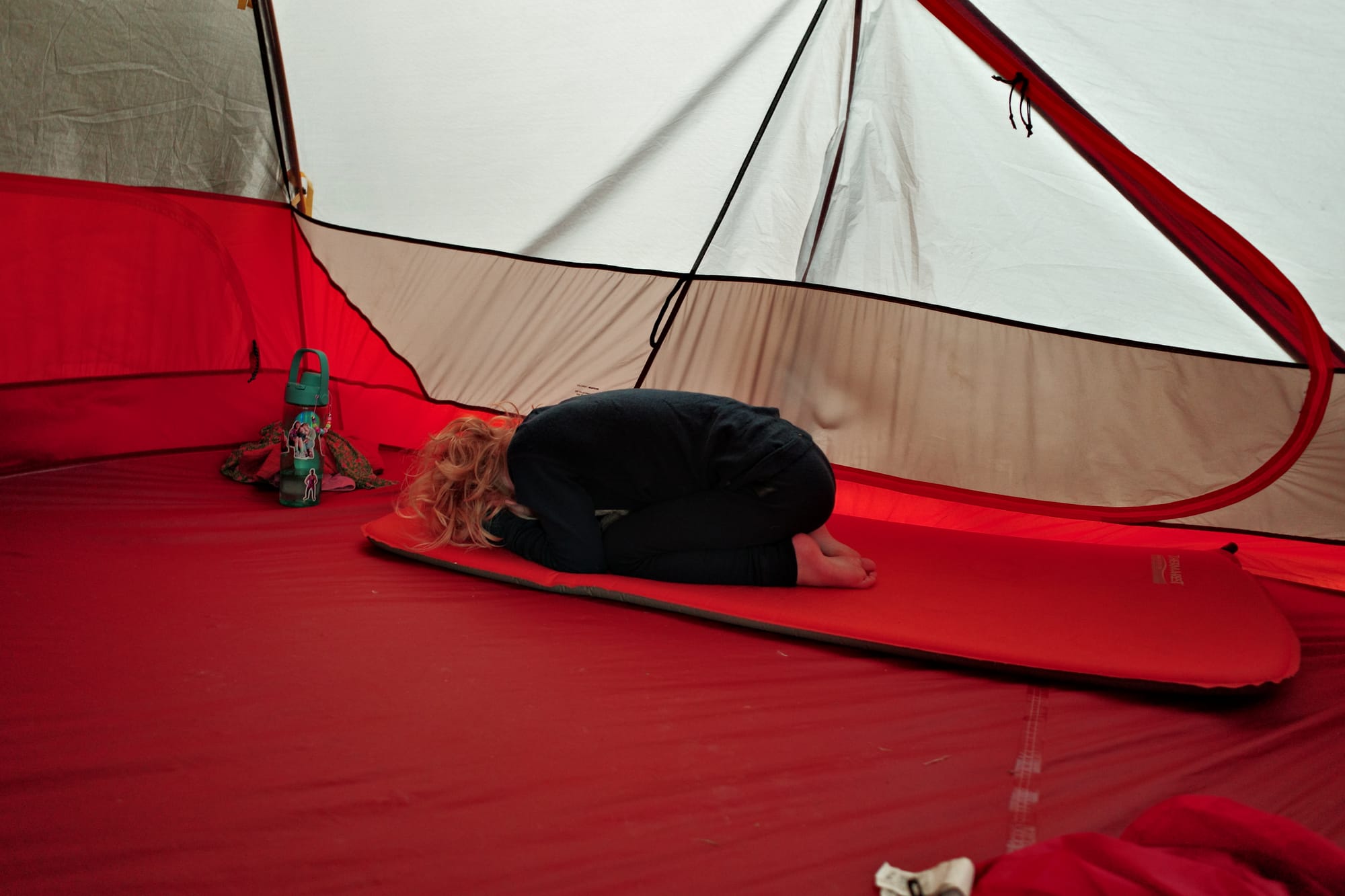 De dag erna stapten we vroeg op de fiets. We hadden eerder kunnen vertrekken als Mira ook uit de tent wil 's ochtends...