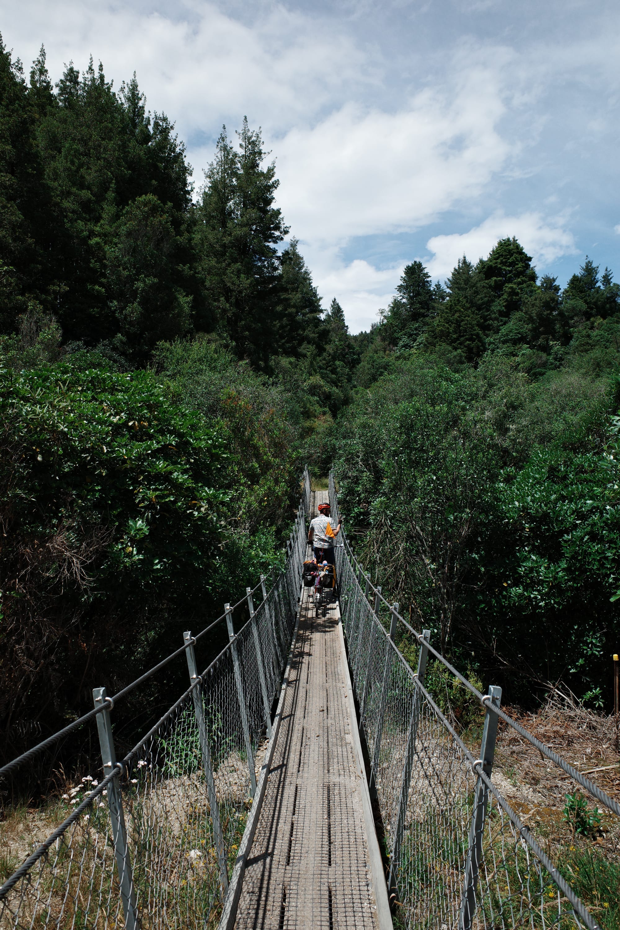 Verder weer wat pittige klimmetjes. We eindigden terug met dezelfde fietsers op dezelfde plek. Wij namen een kamer (even geen tent uit- en inpakken), de Kiwi James (uit Auckland) en de Amerikanen (Josh en Emily) kampeerden. We wandelden nog naar een hangbrug in de buurt: