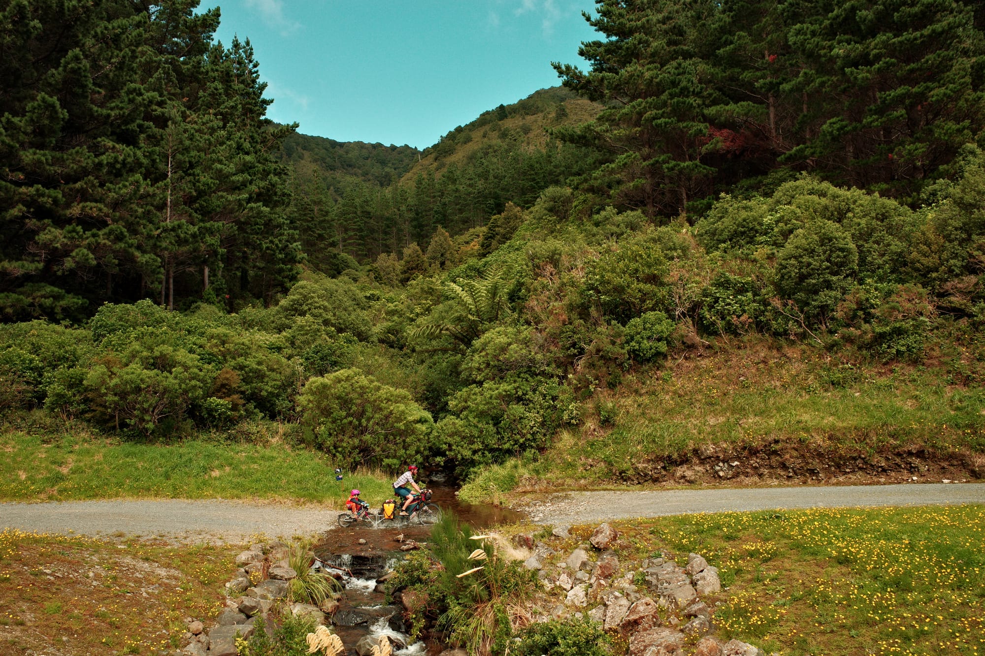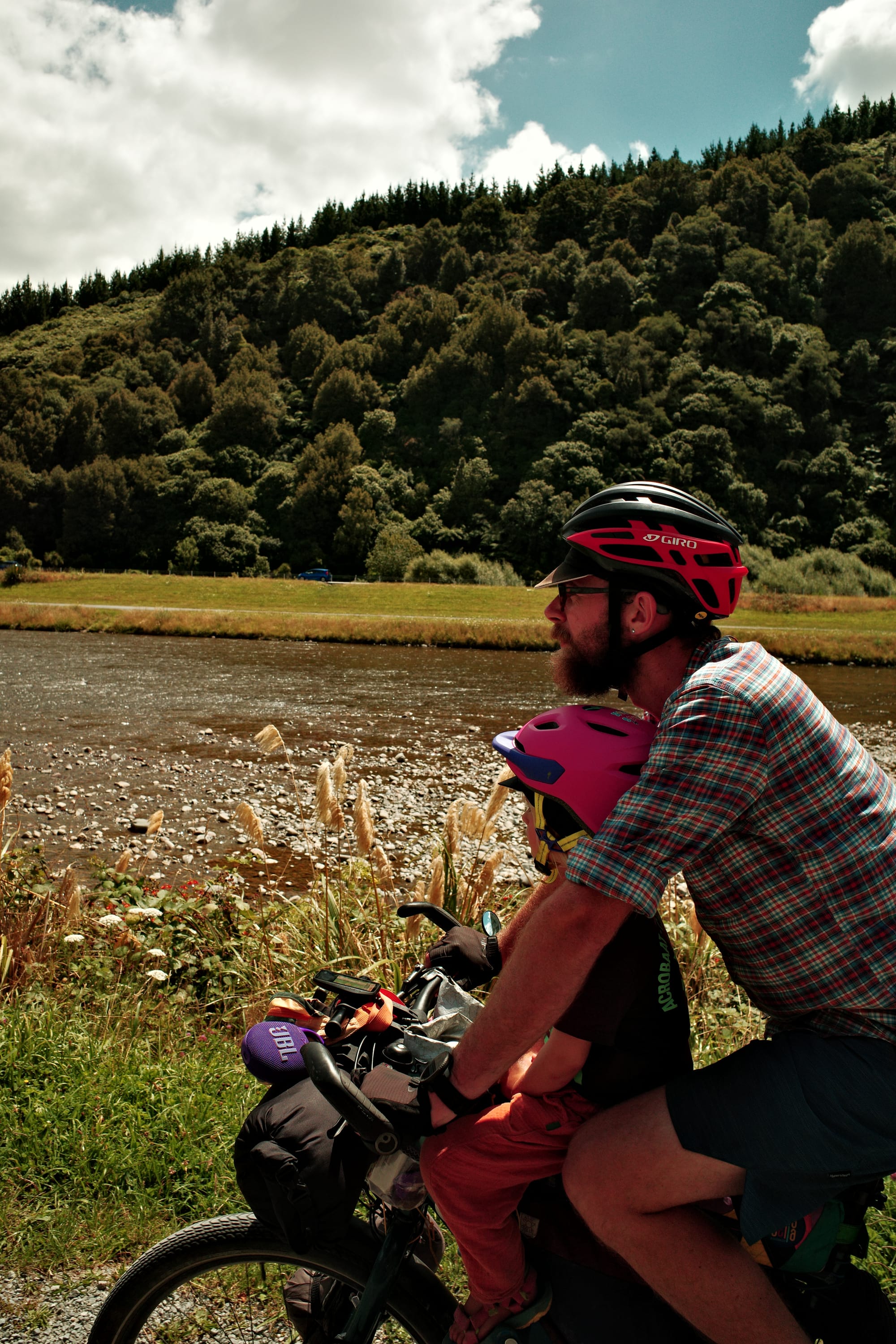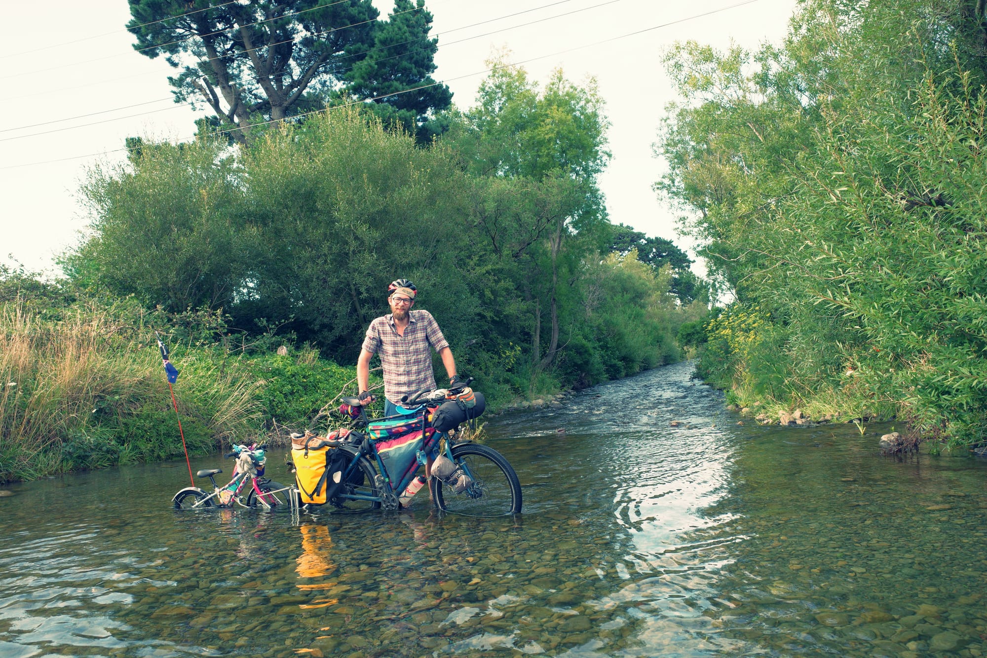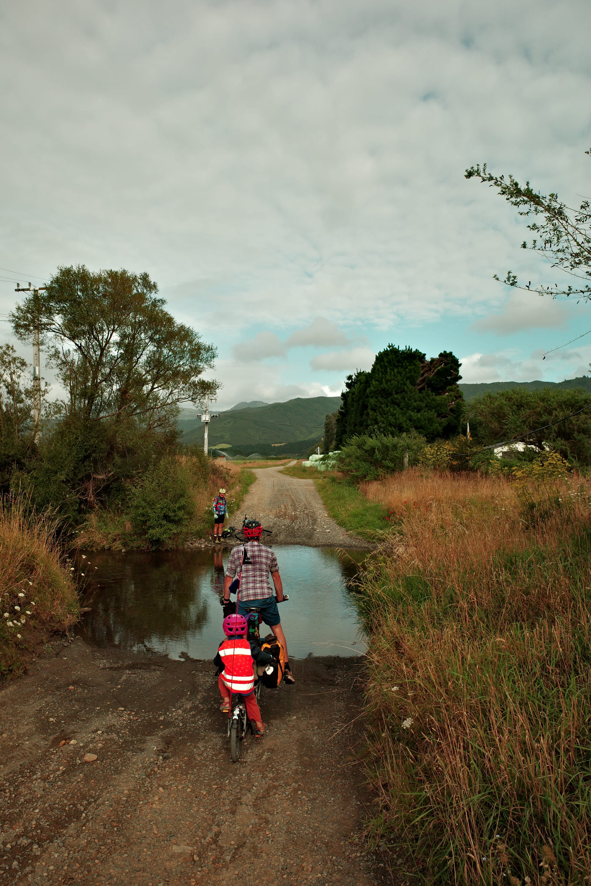 De rit van bijna 90 kilometer begon met een rivieroversteek. Koude enkels en wat natte zakken verder (ik had niet zo goed door dat ik niet het ondiepere pad nam, handig) konden we verder. Vlak daarna kreeg ik een lekke band, maar na een snelle plaksessie langs de weg konden we eindelijk beginnen met de prachtige klim die we al hadden kunnen zien vanaf de camping. Mooi was het zeker, met donkere tunnels en een lange brug, maar ook een heel eind klimmen.