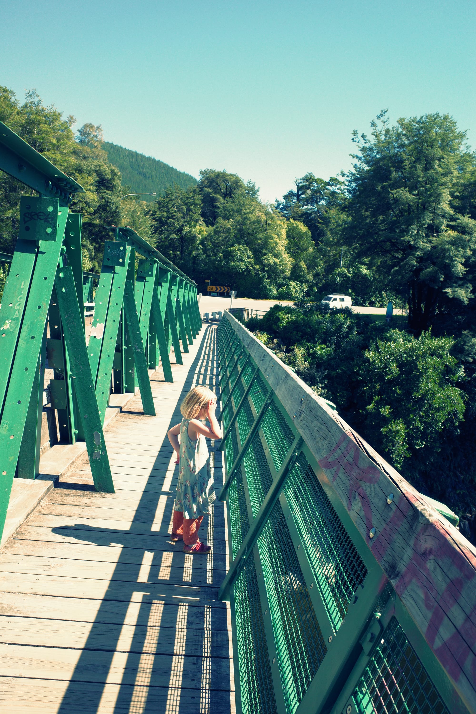De volgende dag ontbijten we rustig aan het cafeetje van de camping en spelen we nog wat op de parking en in het museum aan het cafe. We bekijken ook nog de oude Pelorus bridge naast de camping.