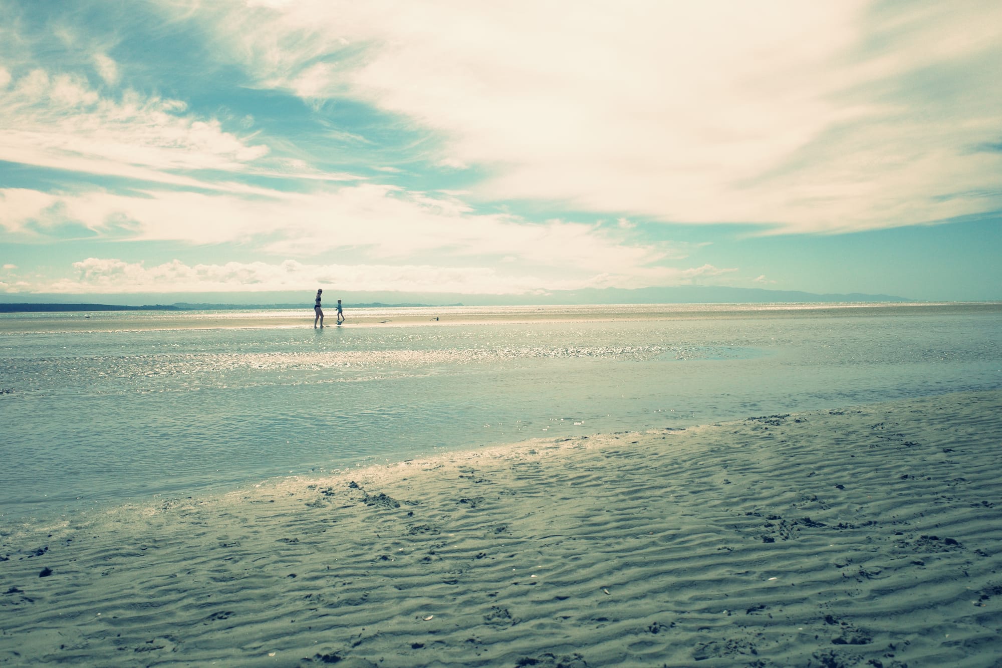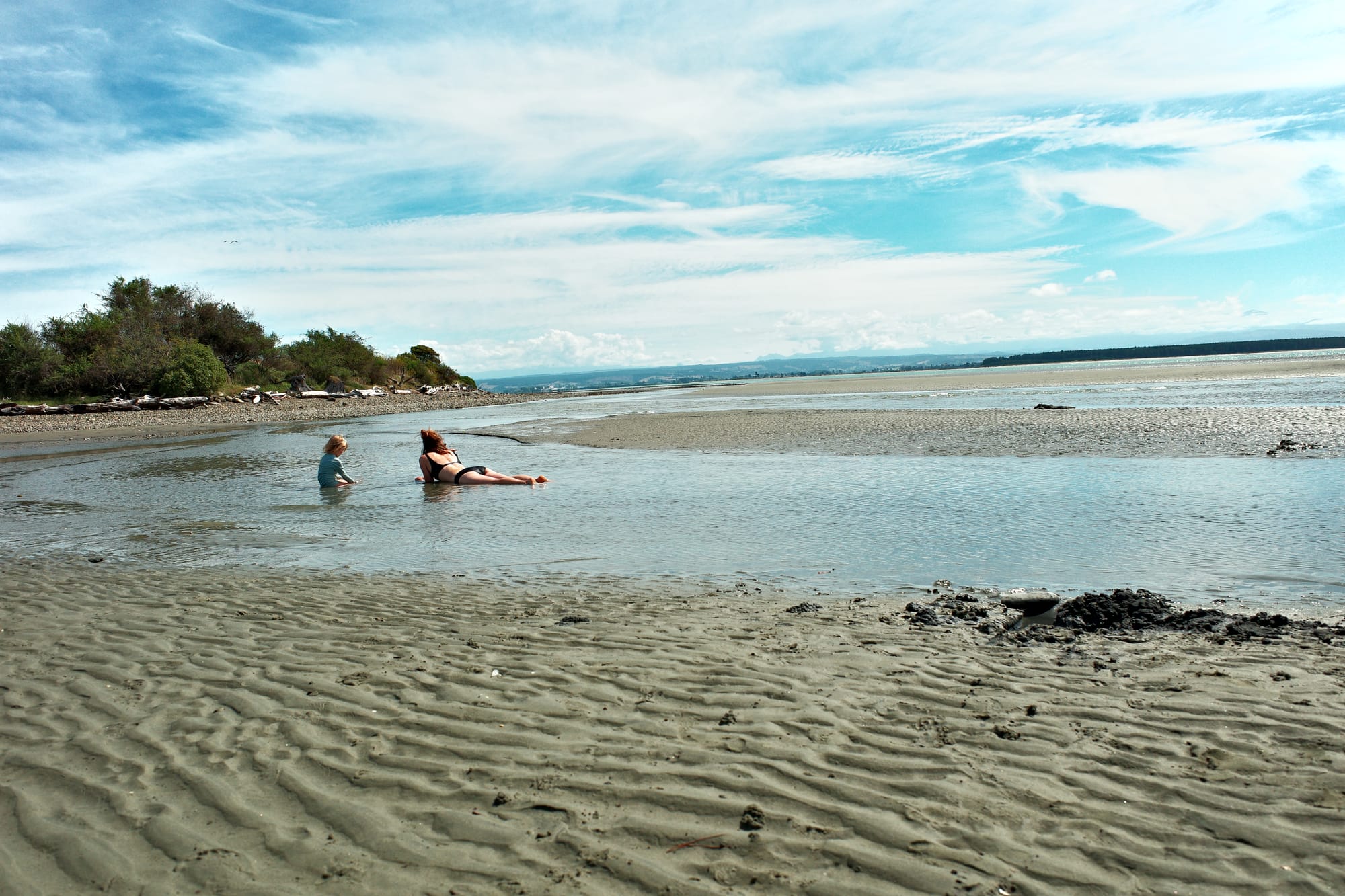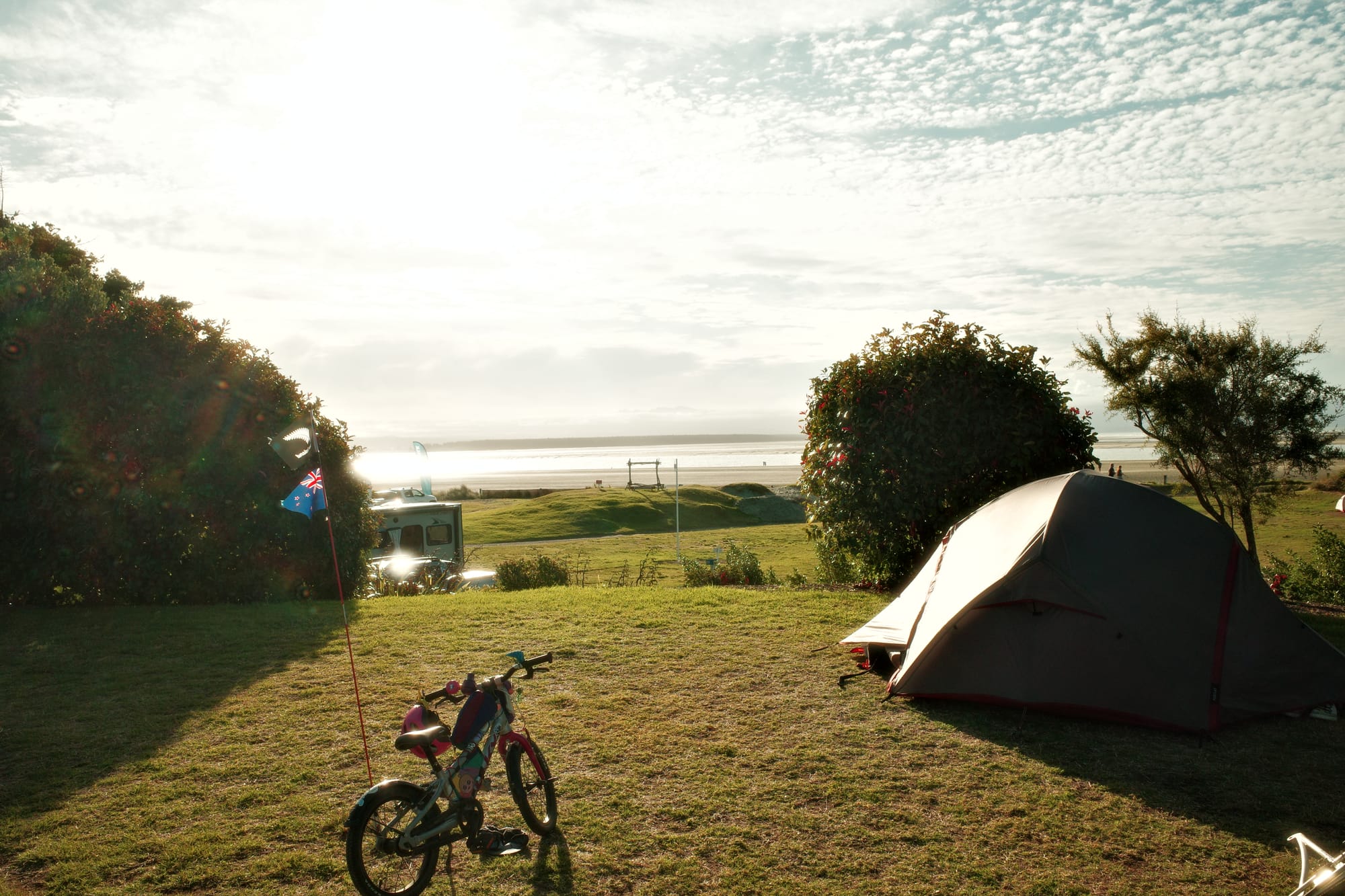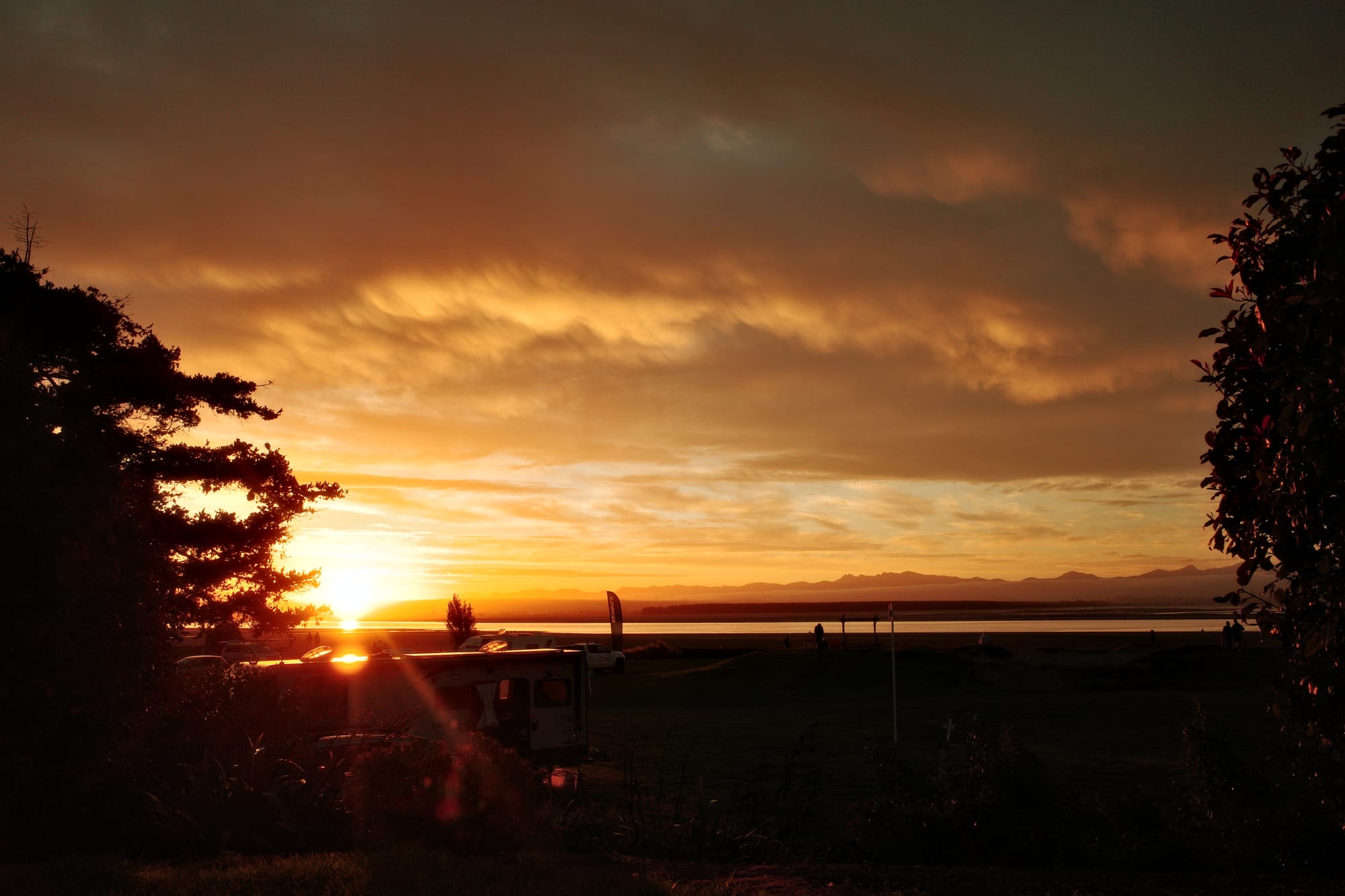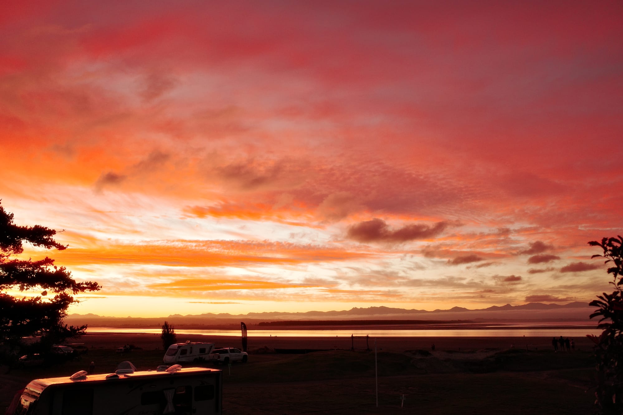 In Nelson worden we afgezet bij een gigantische strandcamping, die gelukkig vrij rustig is. Strandcamping is ook niet gelogen, want op een meter van het hek rond een van de velden ligt het strand.