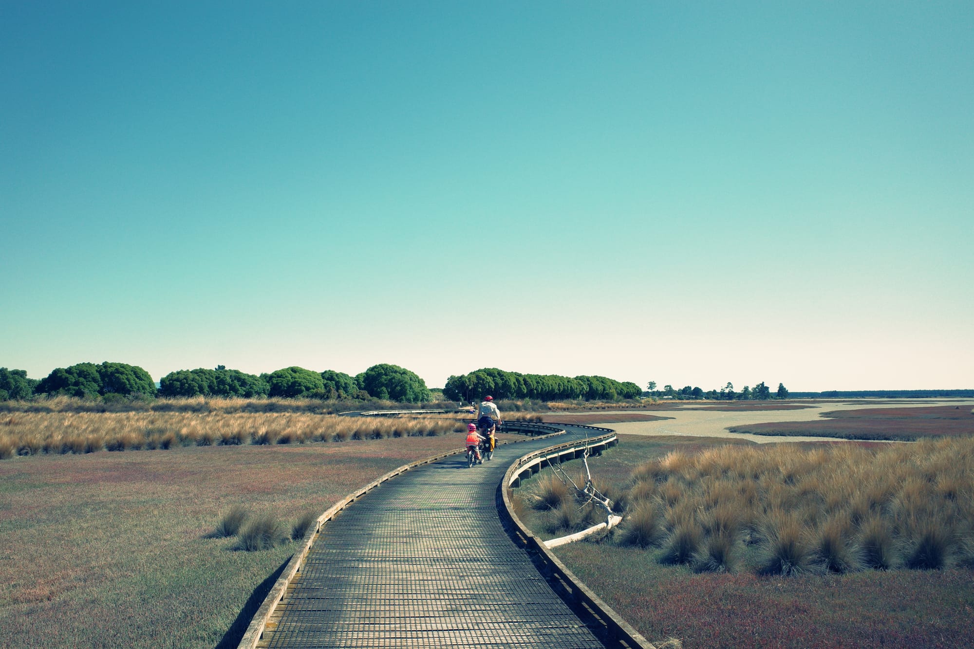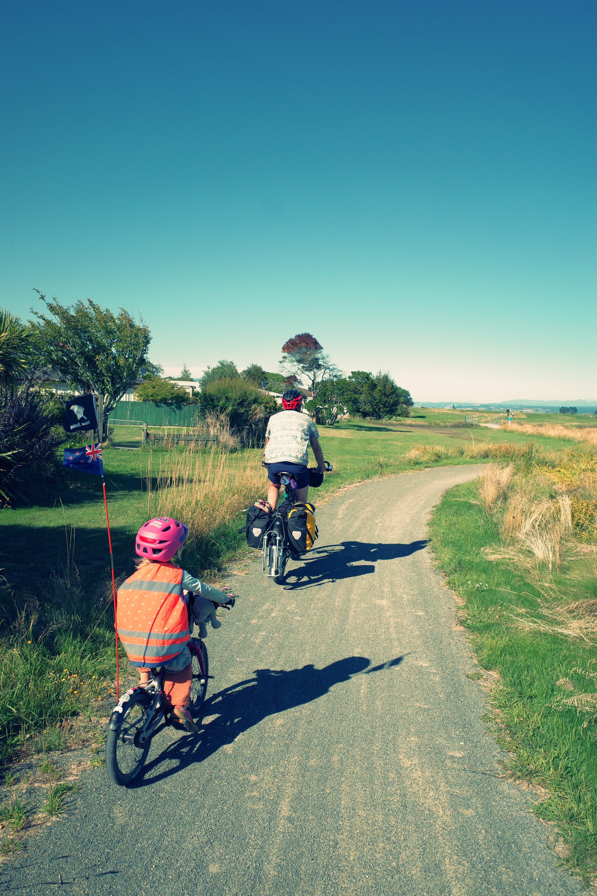 De volgende dag begint met een primeur: Mira kan een stuk zelf fietsen! We volgen een plat fietspad, en de eerste 5 kilometer fietst Mira helemaal zelf.